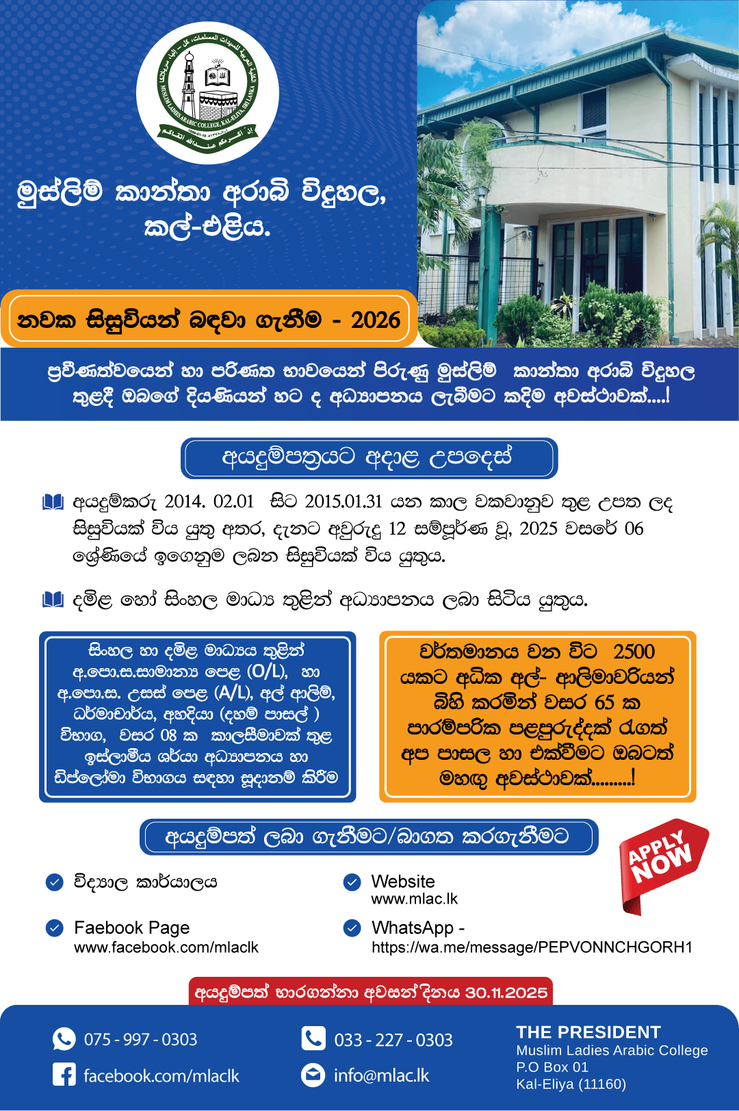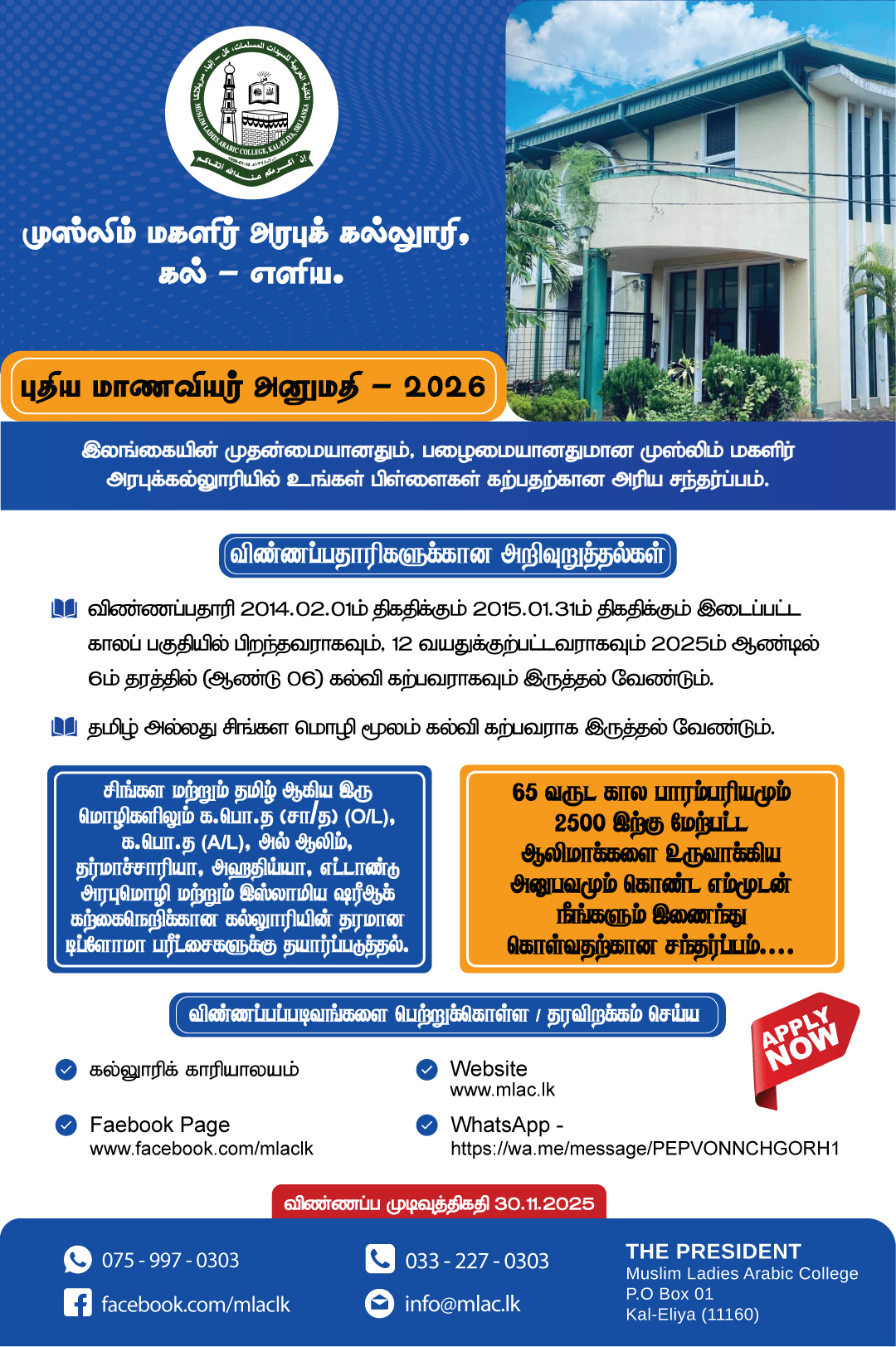 කල් එලියා මුස්ලිම් කාන්තා අරාබි විදුහලේ 2026 වසර සඳහා නව ශිෂ්යාවන්ගේ ඇතුළත් කිරීම සඳහා අයදුම්පත් කැඳවනු ලැබෙයි.